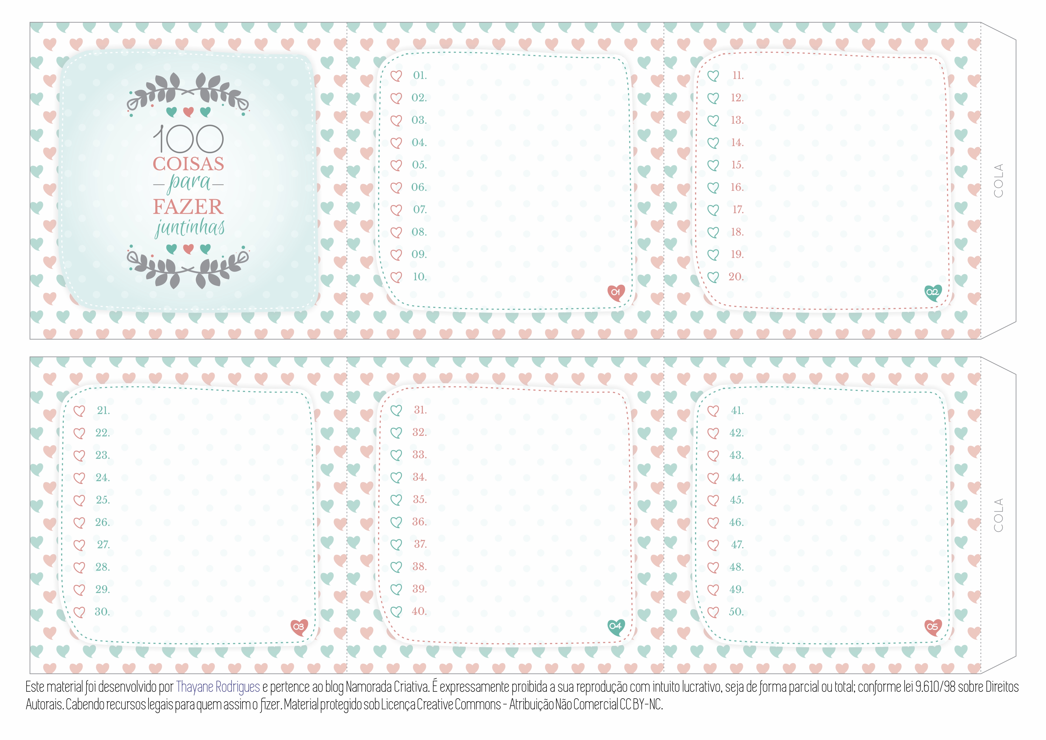 Sabe quando você quer fazer um programa bem legal com a pessoa que é muito especial para você, mas você não tem ideia do quê? Esse DIY vai te ajudar. O projeto de hoje é um livro com 100 ideias para você fazer na companhia do seu amor. A cada ideia realizada você marca o coração ao lado do número. Tem ideias para vários gostos e se você quiser fazer o seu tem os moldes sem texto. É bem fácil de fazer e barato.