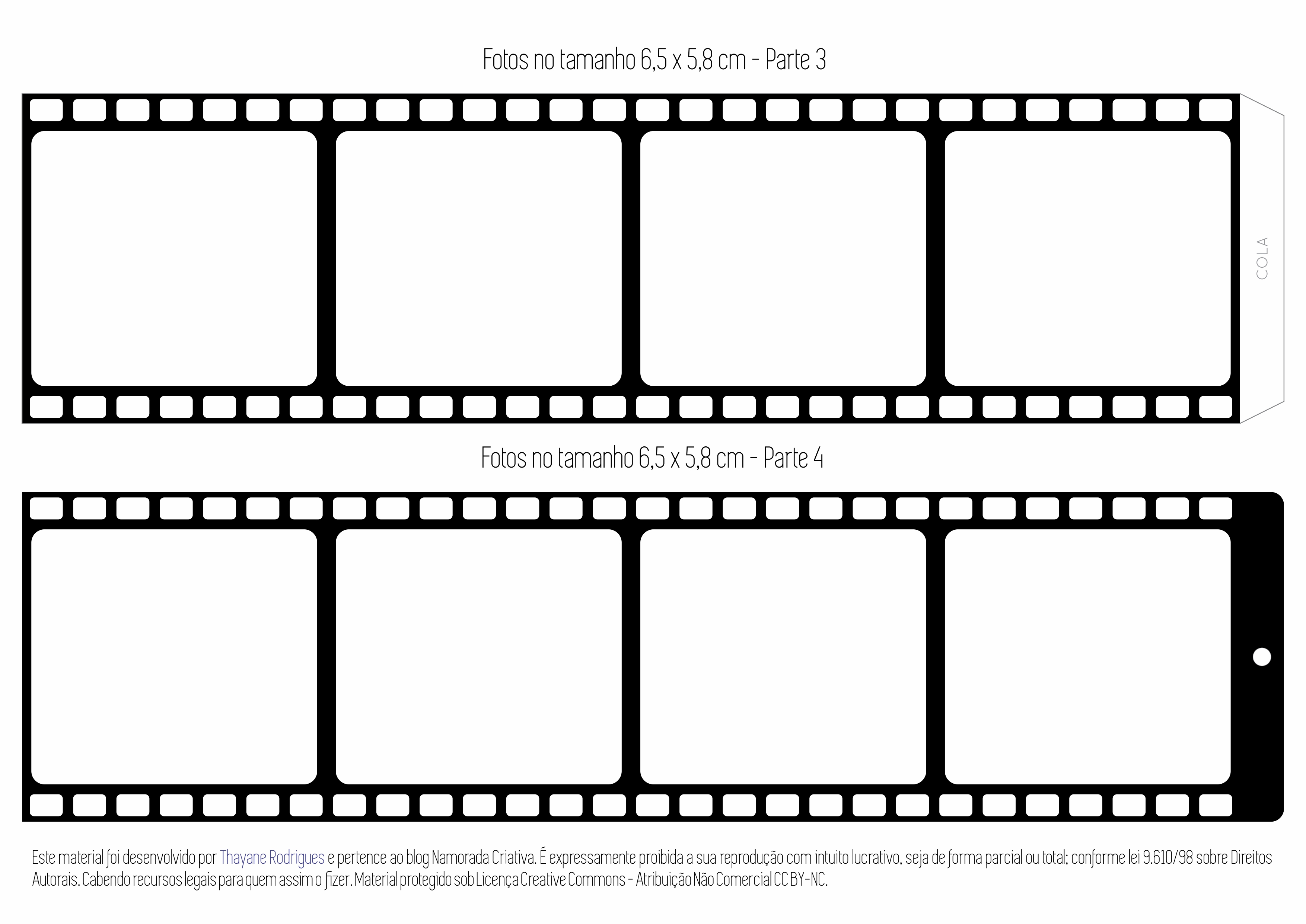 * Opção dos moldes do filme sem texto para fotos no tamanho 6,5 x 5,8 cm, em formato “jpg” para que você acrescente como quiser em algum programa de edição de imagens, como o Photoscape por exemplo: AQUI e AQUI.