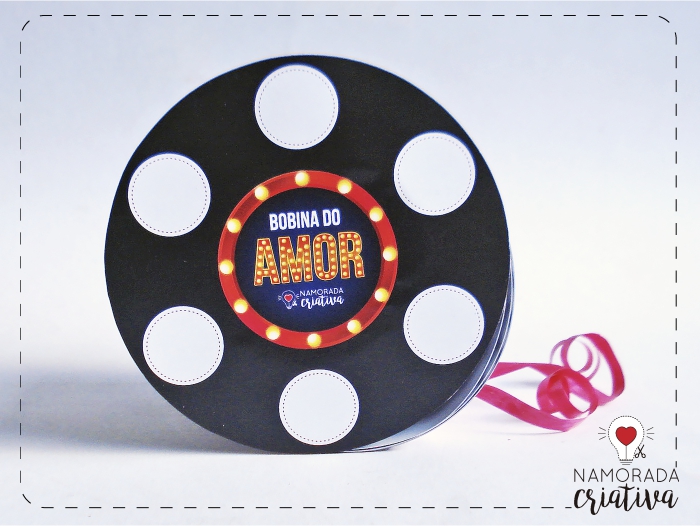 Ele é inspirado em um rolo de filme e dá para você colocar várias fotos de vocês ou fazer como eu fiz: misturar fotos e frases de filmes que combinam com o casal.