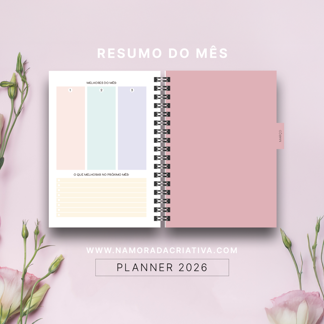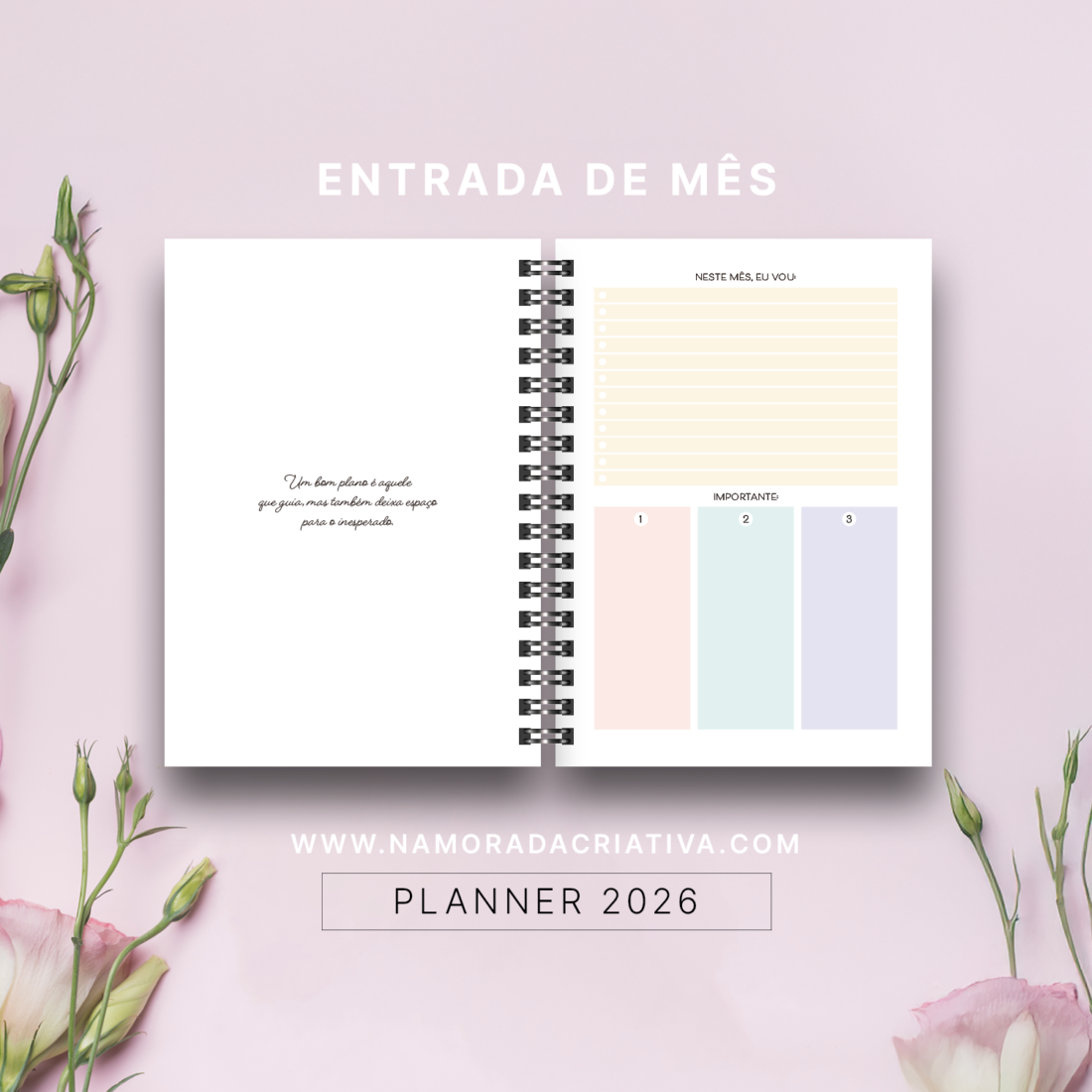 Todo mês começa com um espaço especial para você escrever suas metas e prioridades. Ali você pode registrar o que é mais importante, suas intenções e até aquelas anotações que não quer esquecer.