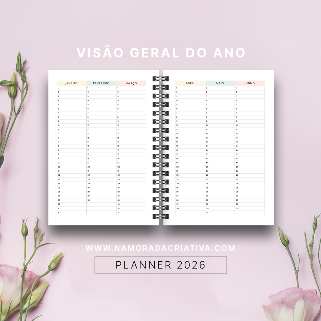 Logo no começo, você encontra o calendário de 2026 completinho, com os feriados já marcados. É perfeito para ter uma visão geral do ano e já planejar datas importantes.