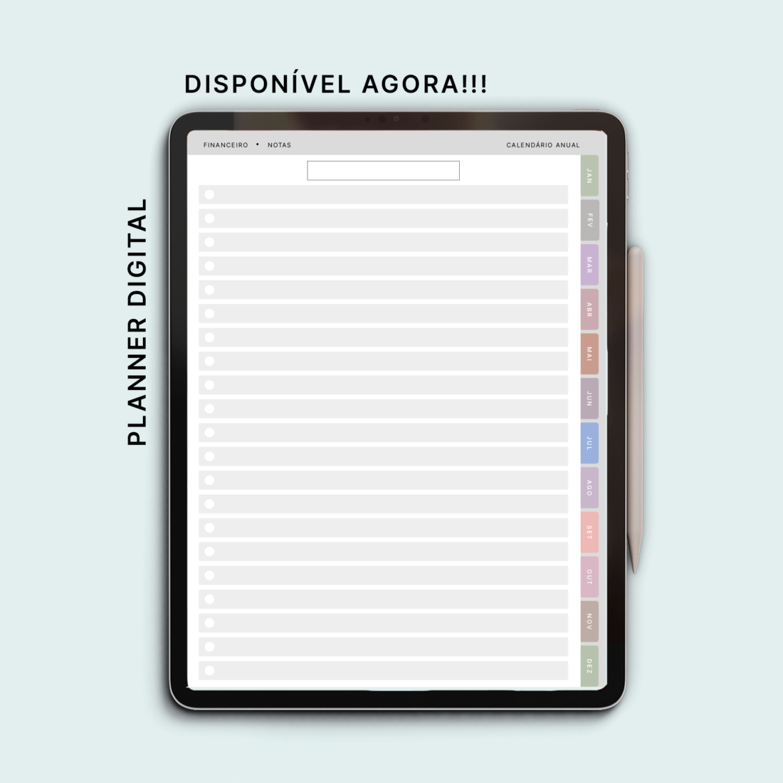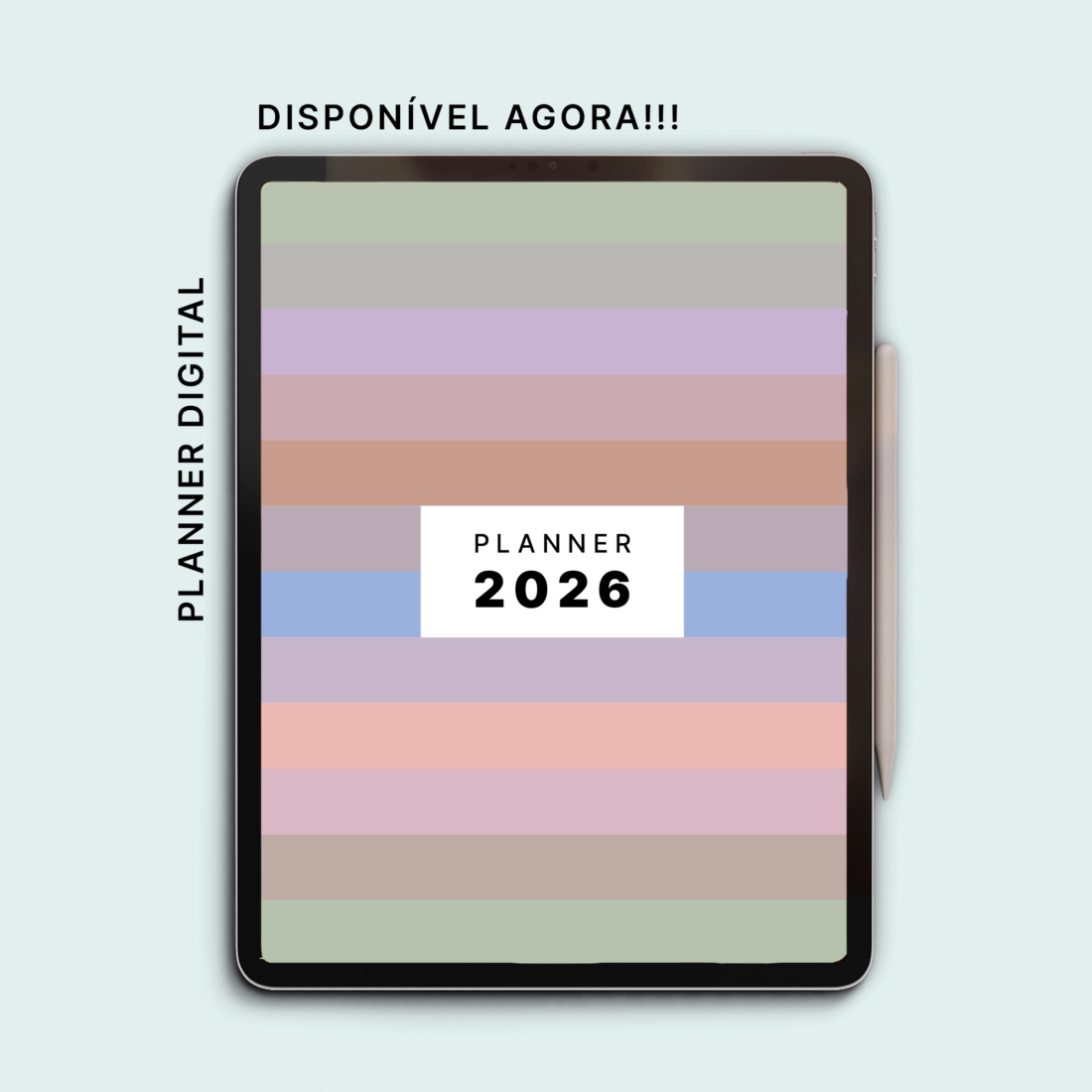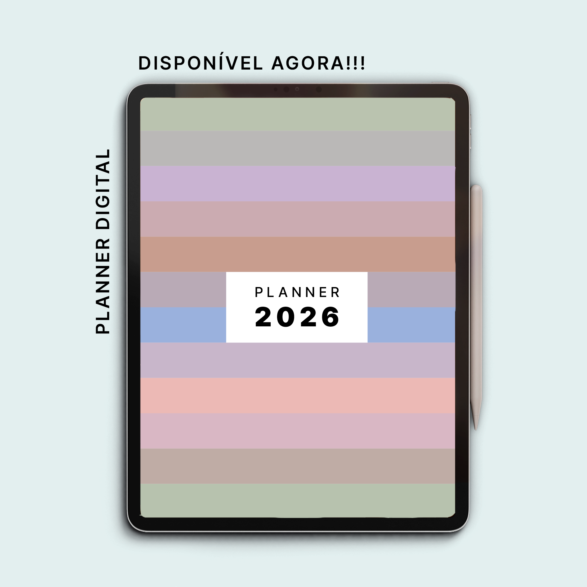Planner Digital 2026 interativo para iPad e tablets. Organize seu ano sem papel.