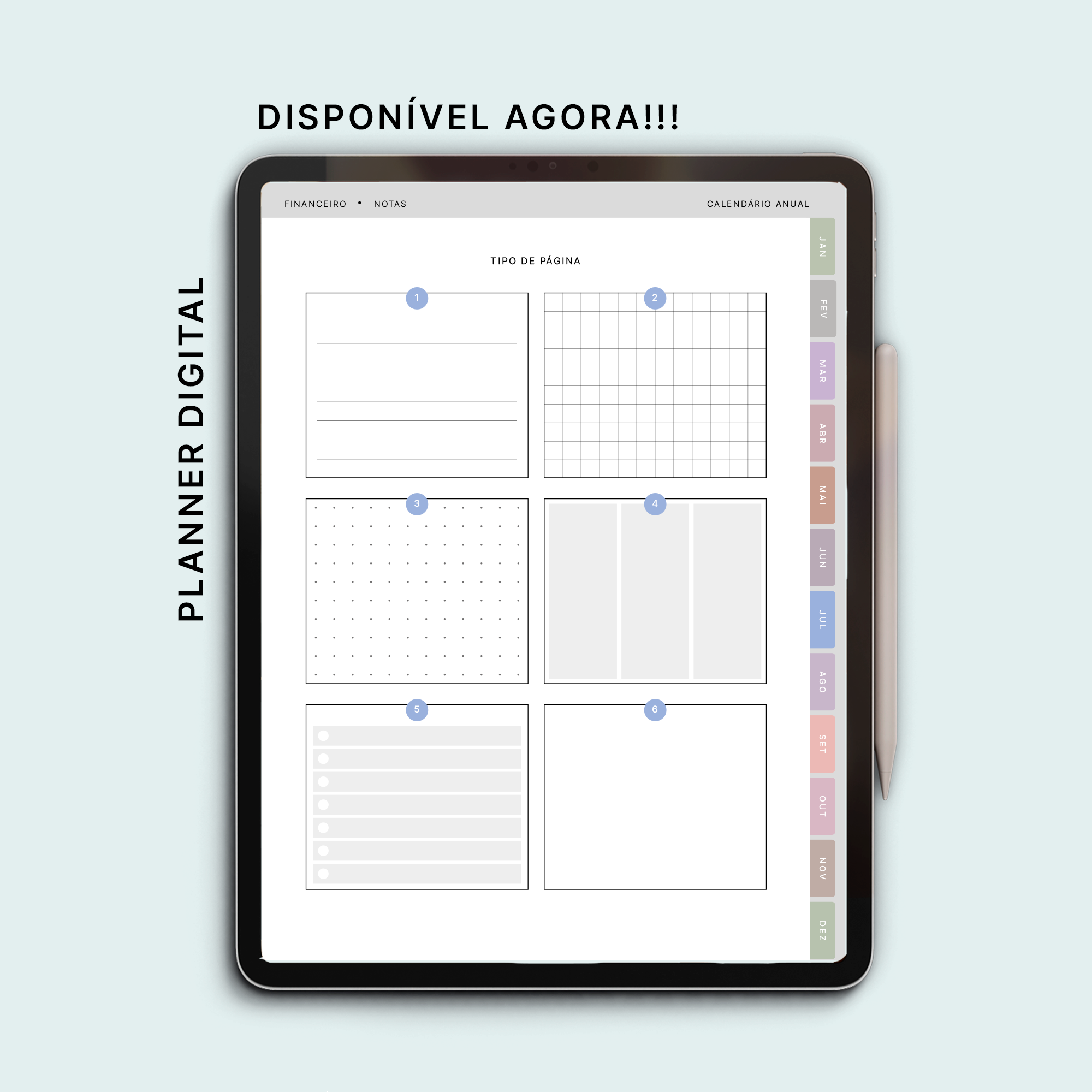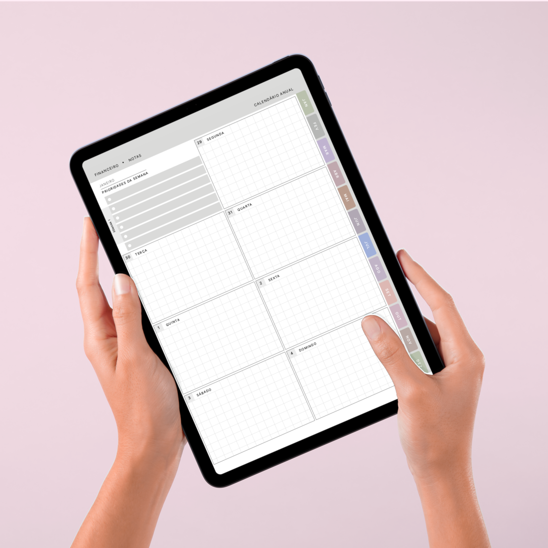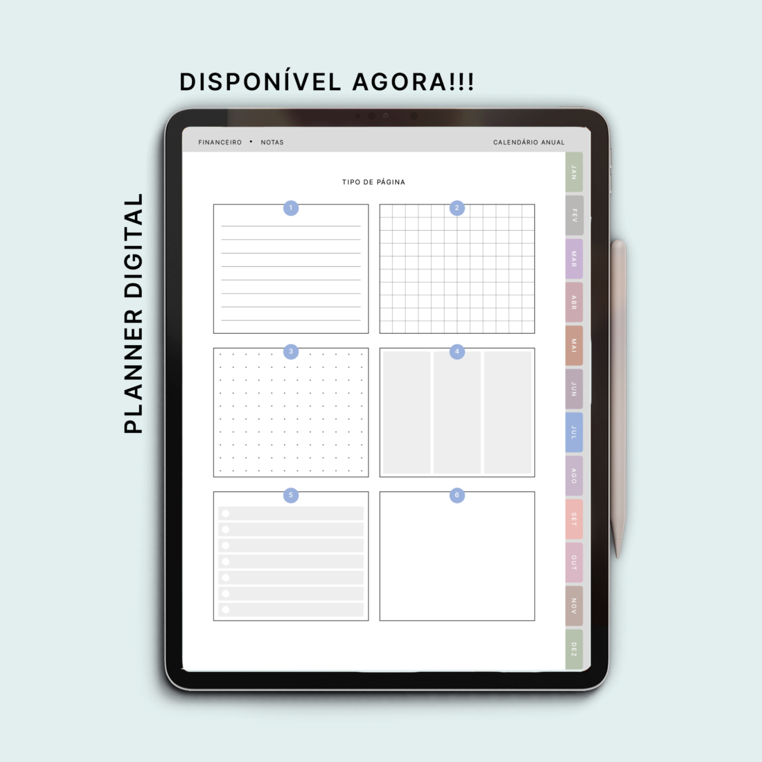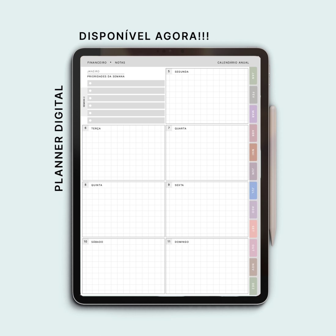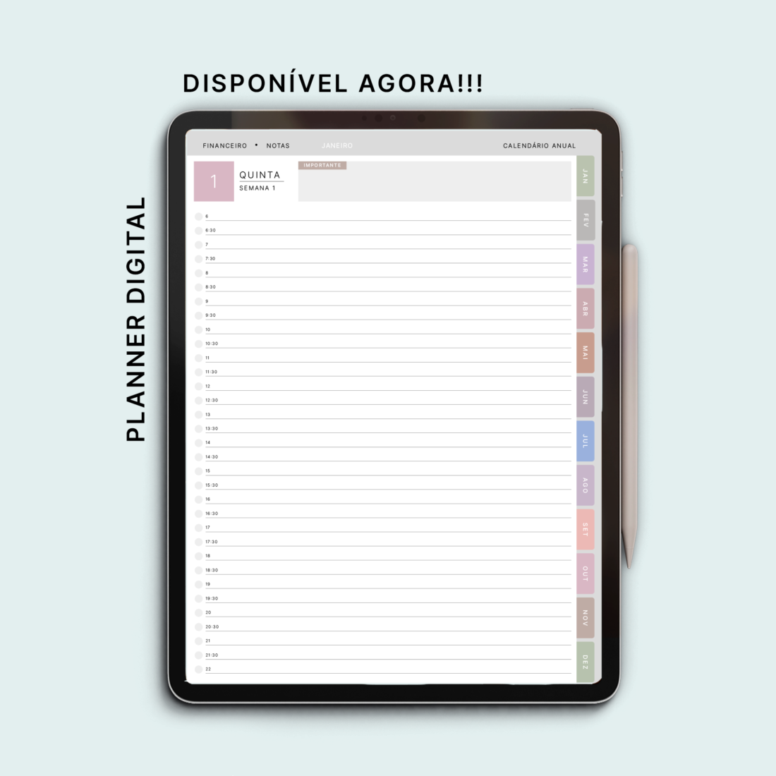 Além de sustentável, o formato digital permite carregar seu planner em qualquer lugar, sincronizar com outros dispositivos e apagar, duplicar ou reorganizar páginas facilmente. É uma solução prática para quem quer manter a produtividade e o foco, sem depender de papel.