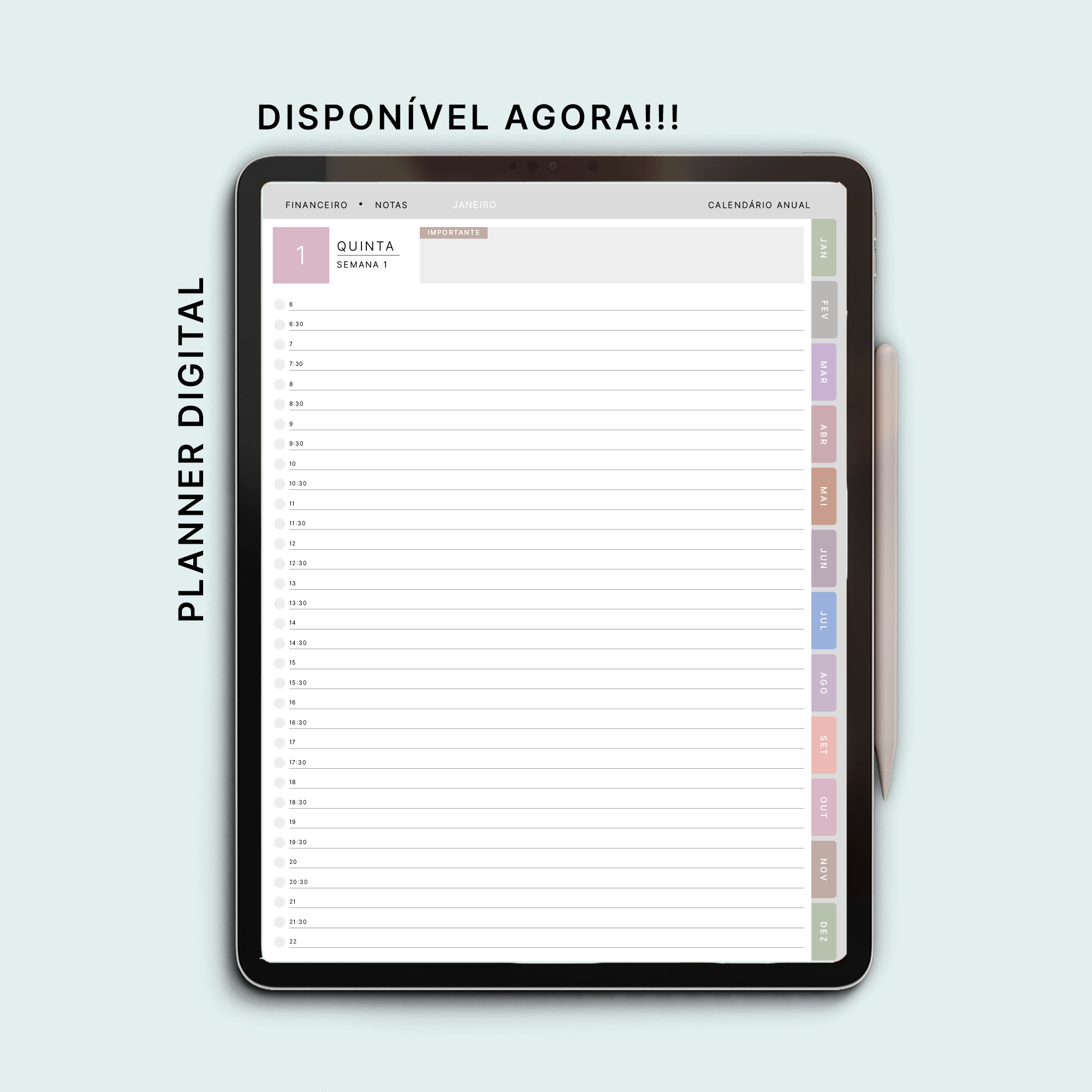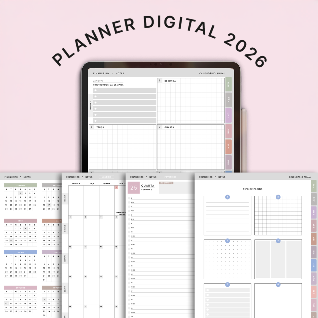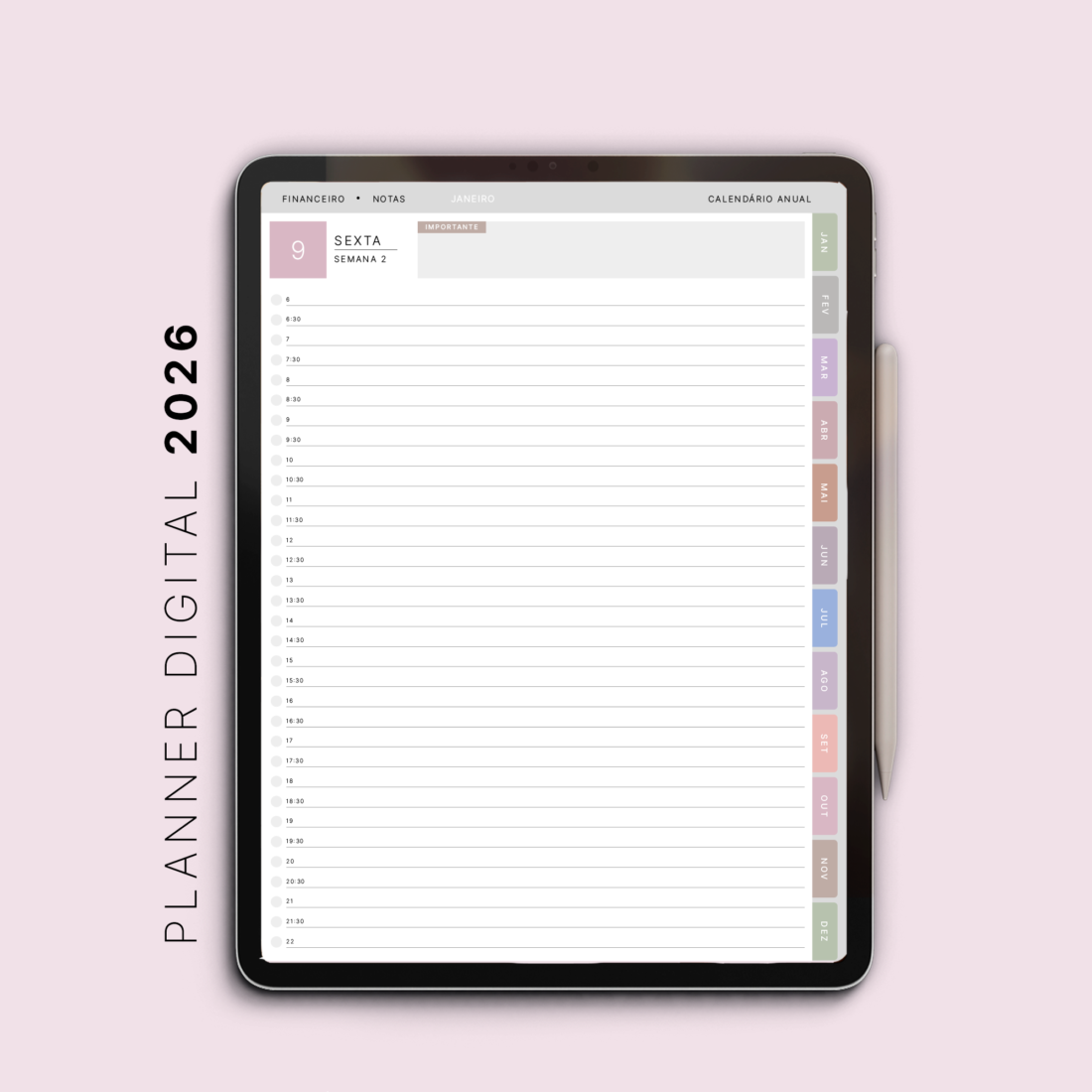 O Planner Digital 2026 Interativo foi desenvolvido para quem quer organizar o ano de forma totalmente digital. Ele substitui o planner físico, oferecendo uma experiência realista e fluida dentro dos aplicativos de anotações como GoodNotes, Notability, Xodo ou Noteshelf, ideais para uso em tablets com caneta digital.