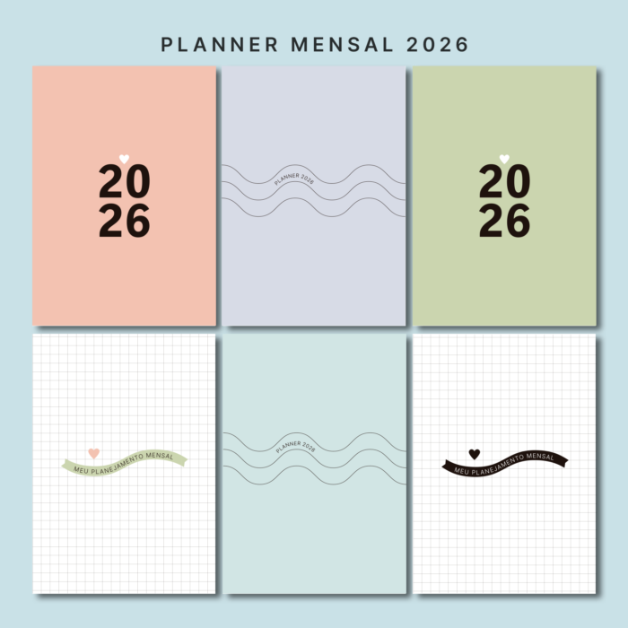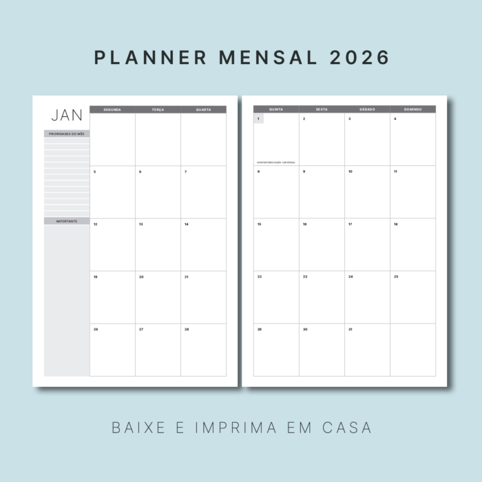 Hoje trouxe pra vocês o planner mensal para 2026. Com as opções colorido e em escala de cinza pra que você escolha o seu favorito ou imprima as duas versões, conforme sua necessidade.