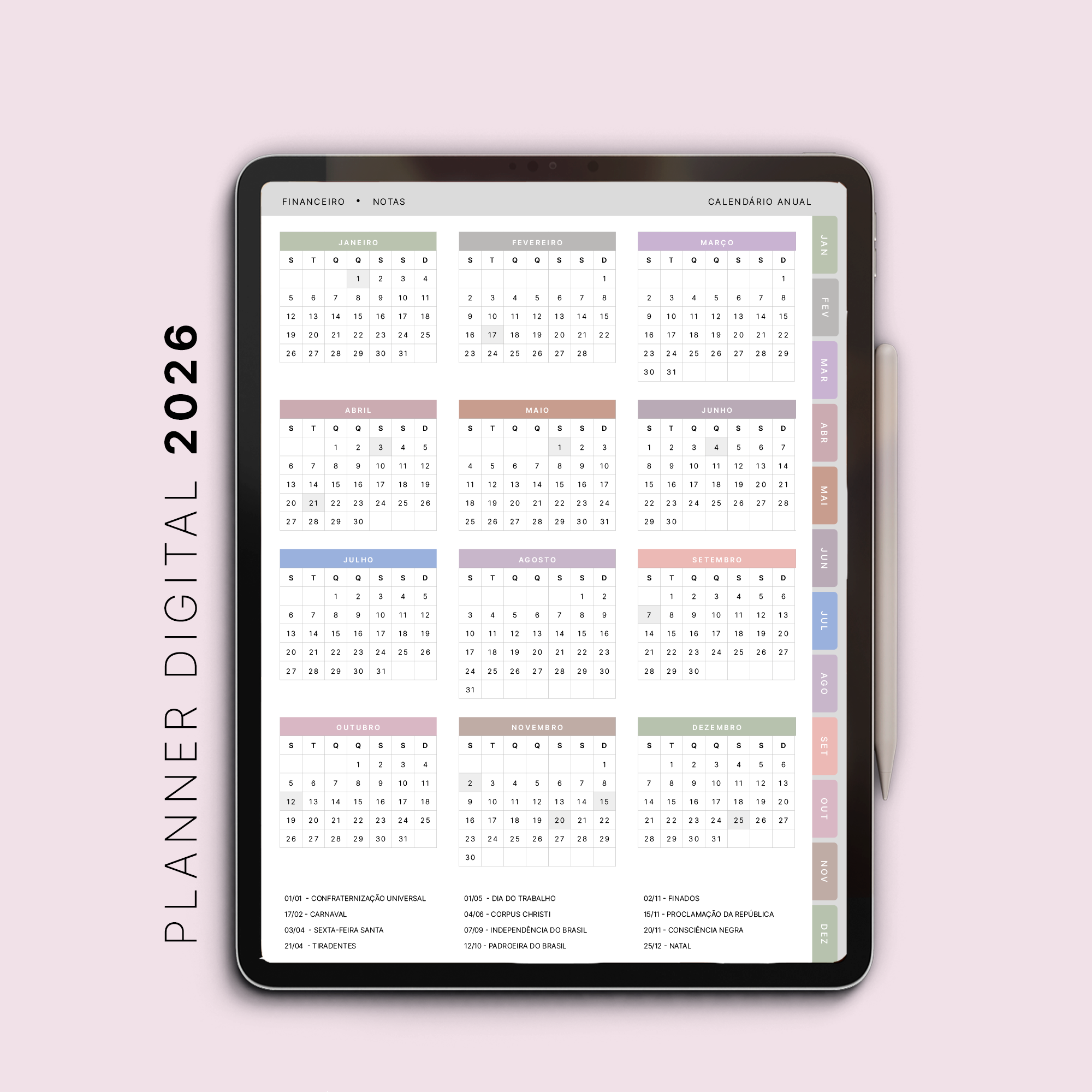 - Calendário anual 2026 completo, com todos os feriados nacionais brasileiros já incluídos.