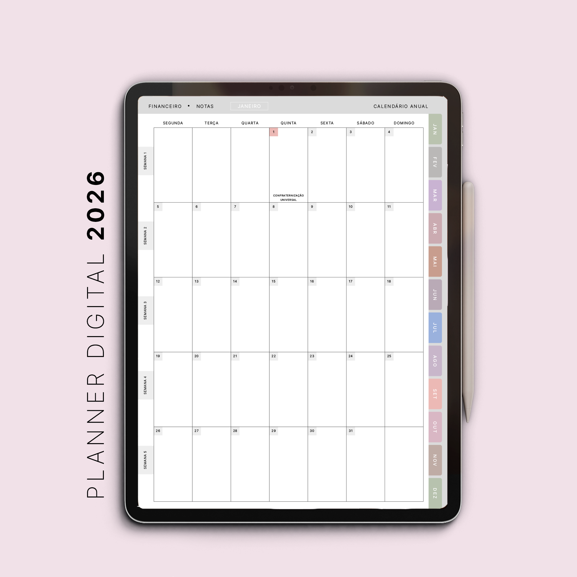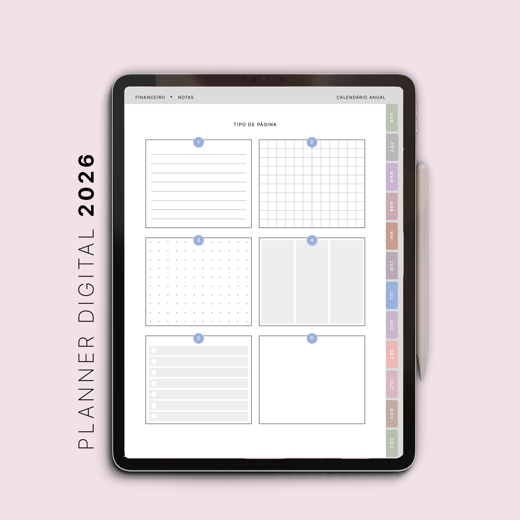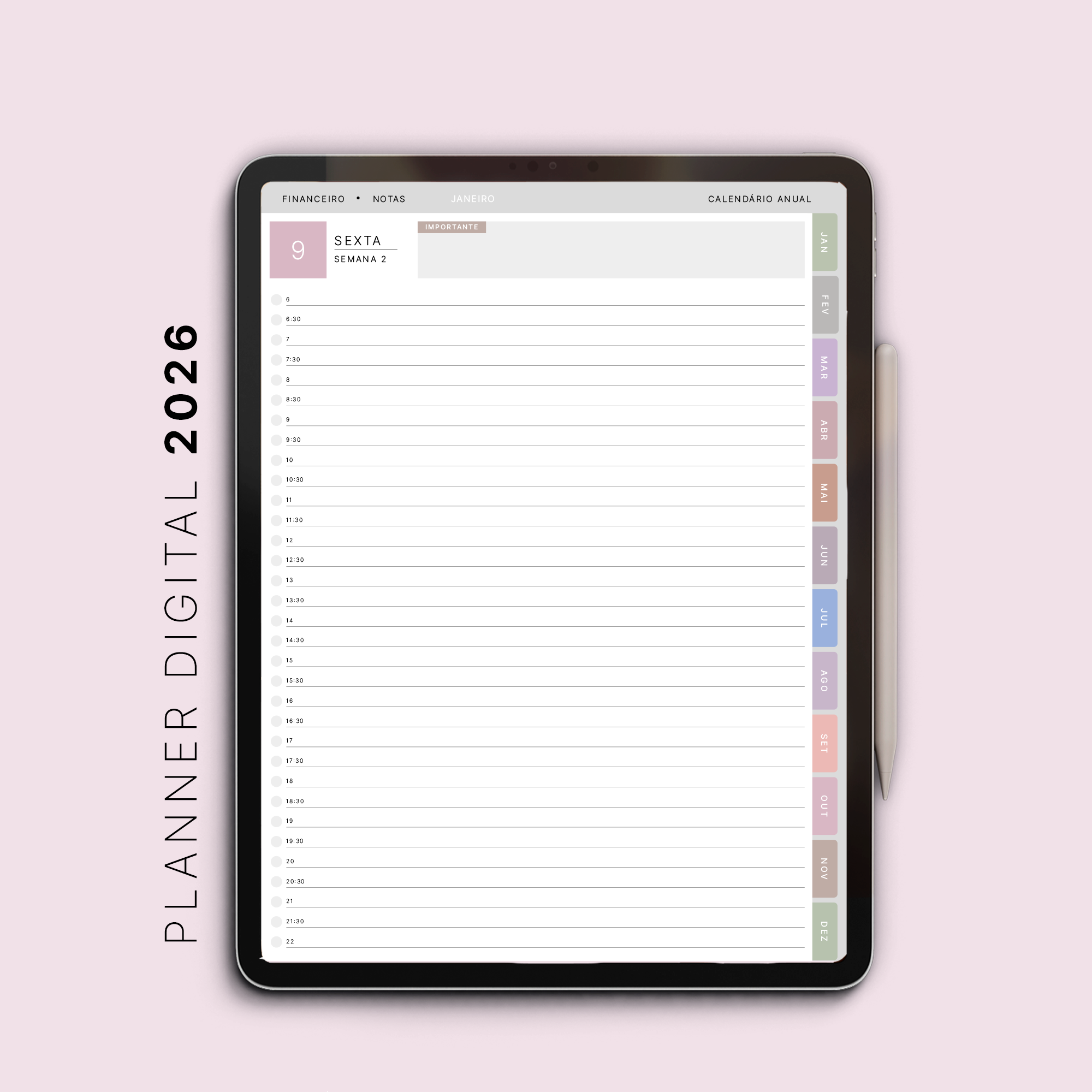 Nada de papéis, impressões ou bagunça: este planner é 100% interativo e compatível com aplicativos de anotações, como GoodNotes, Notability, Xodo e Noteshelf, perfeito para uso em iPads e tablets com caneta digital.
